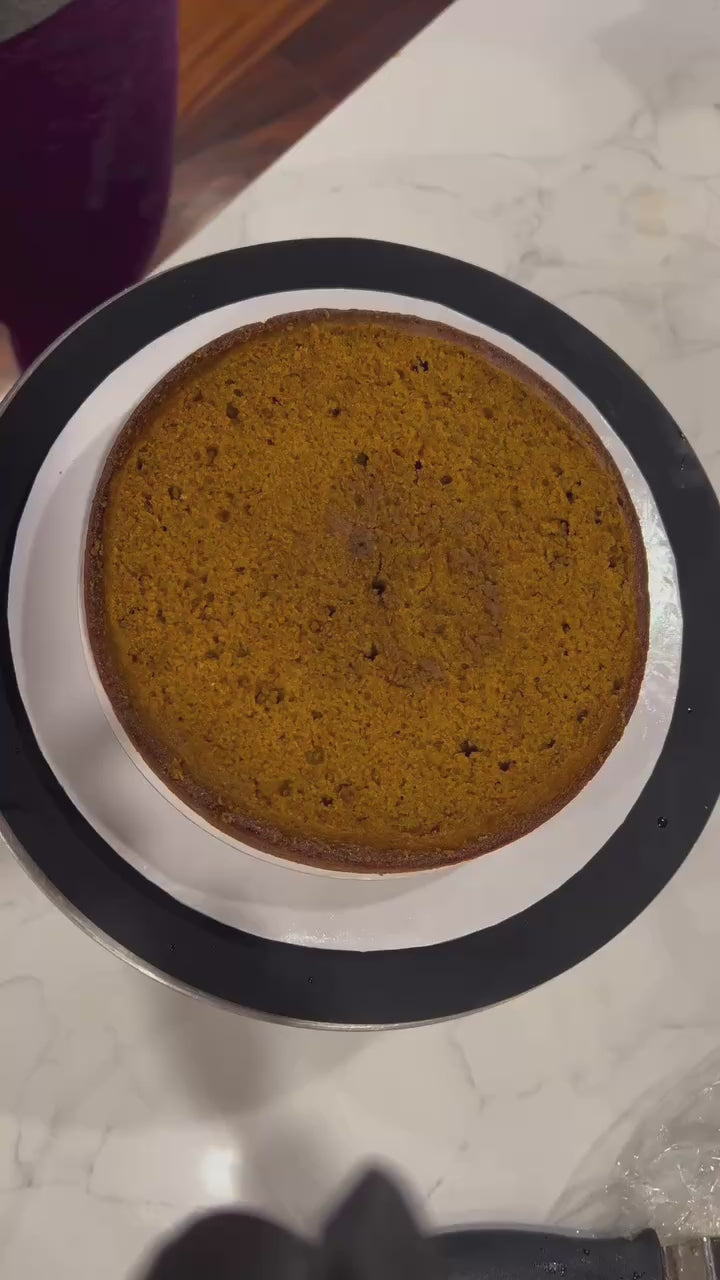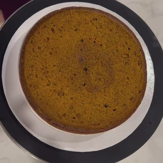 Soft pumpkin cake is layered with brown butter cream cheese frosting, roasted pumpkin ganache, salted biscoff crunch, and decorated with a festive fall wreath. This cake is a 2 layer 8”, and feeds 12-16.